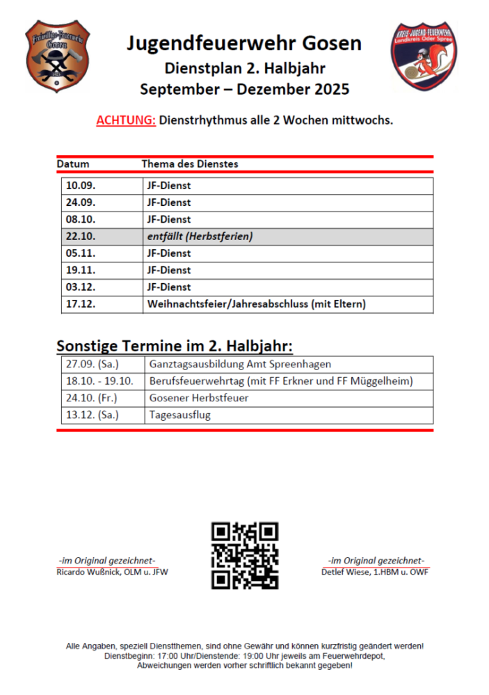 Dienstplan JF 2. Halbjahr 2025